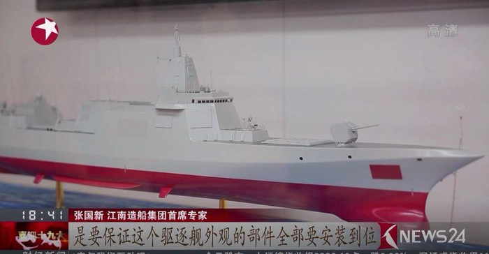 在采访江南造船集团首席专家的画面里,有一个055的模型,虽然现在首艘还在舾装调试阶段,部分设备还未安装到位,不过这个模型已经是全状态了。突兀的是,在本该刷舷号的部位,被一张红色胶带纸给封住了,这自然是官方不想让首舰的舷号过早的曝光,留下了充分的想象空间。在这里瞎猜一个号,101,因为作为具有开创性的一型驱逐舰,其地位完全可以跟新中国海军的四大金刚相当。