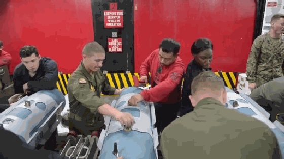 组装弹药的人员来自埃塞克斯号弹药员和美国海军陆战队 (VMFA) 211中队的地勤弹药员,该中队有F-35B 战斗机 。