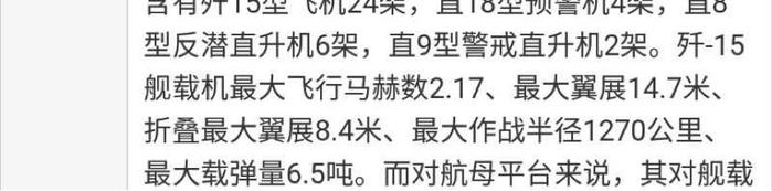 其中提到了辽宁舰配歼十五型舰载机24架,直18预警机4架,直八型反潜直升机6架,直九型警戒直升机2架,并提到歼十五舰载机的最大飞行马赫数是2.17,最大翼展14.7米,折叠后最大翼展8.4米,最大作战半径1270公里、最大载弹量是6.5吨,另外还提到了航空口和船舶口的协调问题,歼十五的折叠后翼展比苏33大了一米,据说是因为搞错了数据,影响了之后研制的歼16的战斗力。