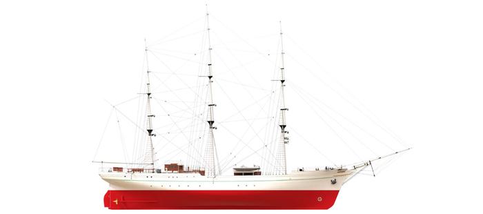 设计CG图。中国海军的破浪号风帆训练舰是广船国际在2630型帆船图纸的基础上,结合部队实际训练要求设计建造的,在外观装饰上也融入了中国的民族特色。