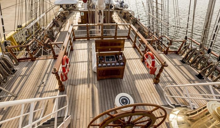 2630型风帆训练舰是荷兰达门船厂设计建造的一种先进、成熟、可靠的训练帆船,号称“最现代化的传统飞剪船”。该船为全帆装三桅钢质帆船,全长85米,排水量1200吨,最大风帆面积2630平方米,最高航速18节,只需25名船员即可安全航行。