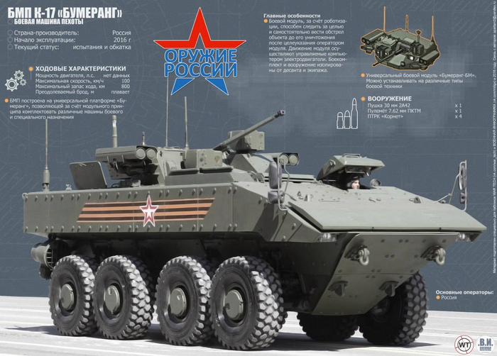 之前在2015年胜利日阅兵亮相的是在“回旋镖”平台上研发的装甲人员输送车,主要武器是1门2A42型30毫米口径自动炮,备弹500发。此外还有1挺口径7.62毫米的并列机枪,备弹2000发。车载制导武器是4枚“短号-D”反坦克导弹,最大射程超过8千米。