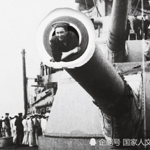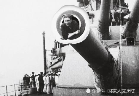 一名水手正在“伊丽莎白女王”号战列舰的15英寸主炮炮筒内,以展示该战列舰主炮的威力
