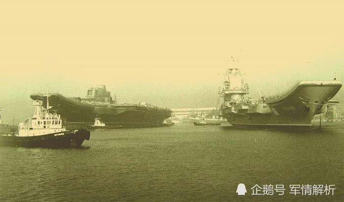 (黑海造船厂内的瓦良格号(左)与库兹涅佐夫号(右))