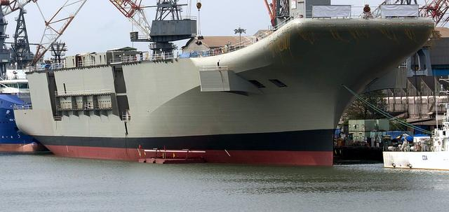 图为"首次下水"后的"维克兰特"。其后部和外侧模块尚未安置。