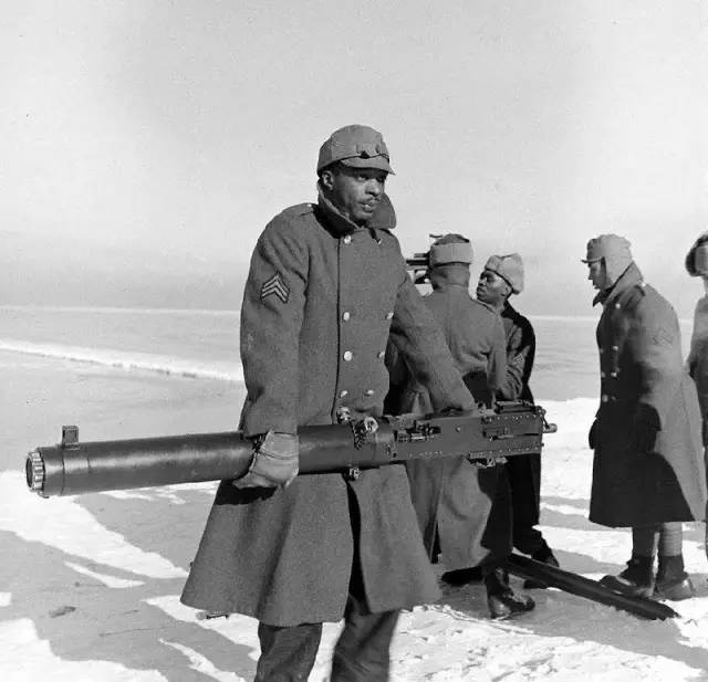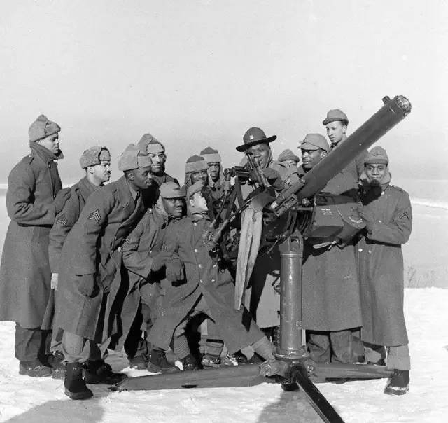 1941年1月,安大略基地,美军第369海防炮兵团的士兵正在这里学习操作M2水冷管高射机枪。