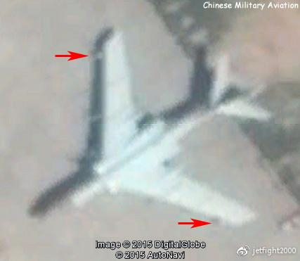 西方卫星拍摄的加挂电战吊舱的H-6K,疑为H-6KH原型机