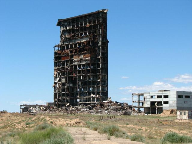 图为接收天线大楼的正面细节。拆毁这座建筑,总共花了700万美元。在拆毁该建筑时,哈萨克斯坦环境部长还挪用了公款,后被判处监禁4年。
