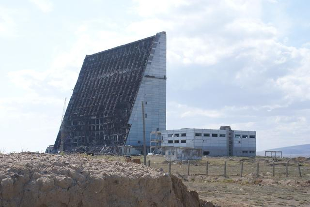 达里亚尔-U型相控阵雷达的接收天线大楼背部特写。2004年的火灾之后,这座大楼存在了一段时间。2010年,由于长期没有拆掉,造成垮塌事故,一名当地人被压死。