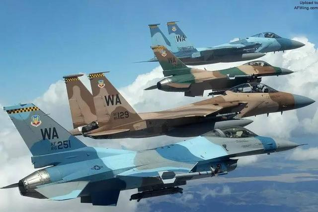 图2美军“入侵者”中队的F-15和F-16战机,模拟俄罗斯、东南亚和南美洲国家空军涂装