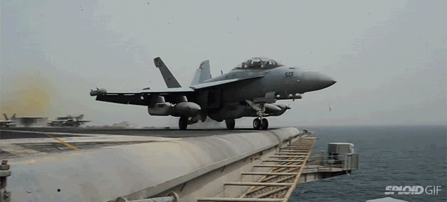 发出弹射起飞的指令,弹射器操作员打开开关,蒸汽弹射器以220千米左右的速度把飞机打出去