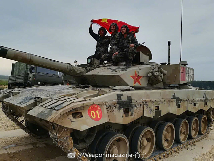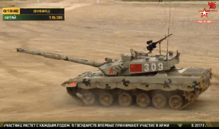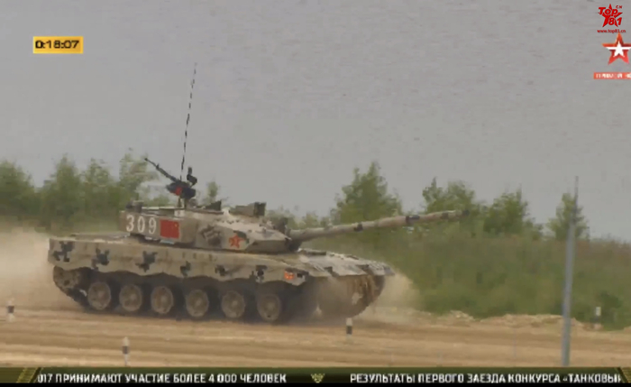 最终,代表中国参赛的309车组在29日当天本小组进行的第一场单车赛中以零故障零失误、全程耗时19分35秒的时间以及火炮、高射机枪、并列机枪射击全中的好成绩获得小组第一,同时也是当天进行比赛的两个小组中成绩最好的一支参赛代表队。图为比赛中的96B坦克。