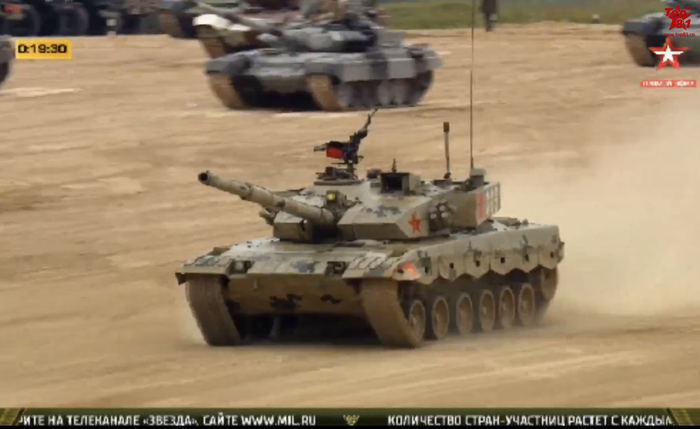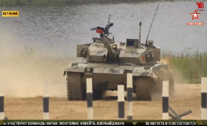 此次参赛的各国代表队大多数使用的是俄罗斯方面提供的T-72B3主战坦克,俄罗斯自用的是性能更优异的T-72B3M型,而中国、白俄罗斯、印度三国则自带坦克参加,其中中国使用的的是96B主战坦克,白俄罗斯使用的是T-72主战坦克,而印度则使用的是自带的改进后的T-90S坦克。图为正在高速通过比赛区域的96B主战坦克,后方扬起滚滚的黄土。