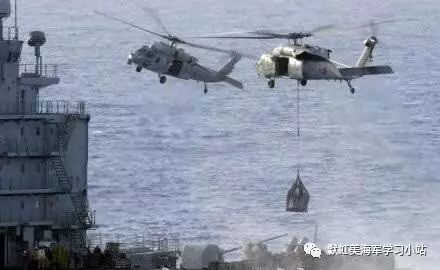 美军补给舰航行中的弹药和干货补给现在多通过直升机垂直补给,因为这样就不需要两舰之间架设钢缆,几个小时保持严格的同速同向等距离,好聚好散,更灵活。