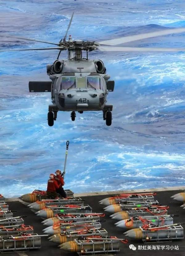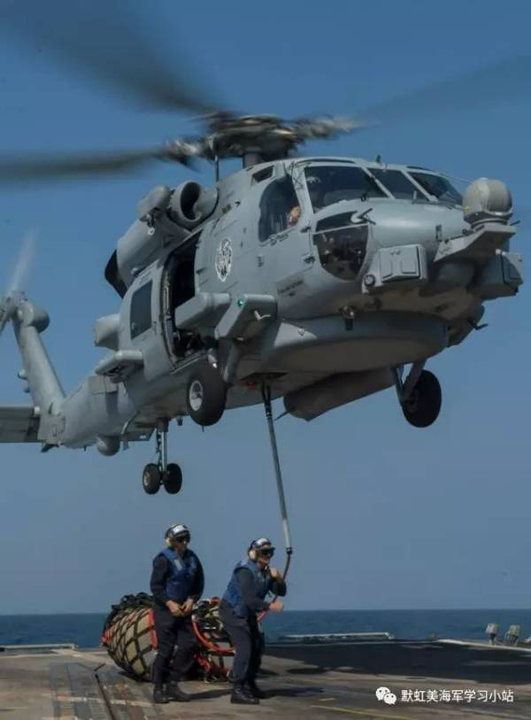 即直升机不是落到飞行甲板上在装卸载,而是直升机保持悬停,货物通过一个吊杆,直接挂在直升机肚皮下面的一个挂钩上。这样的好处是:
