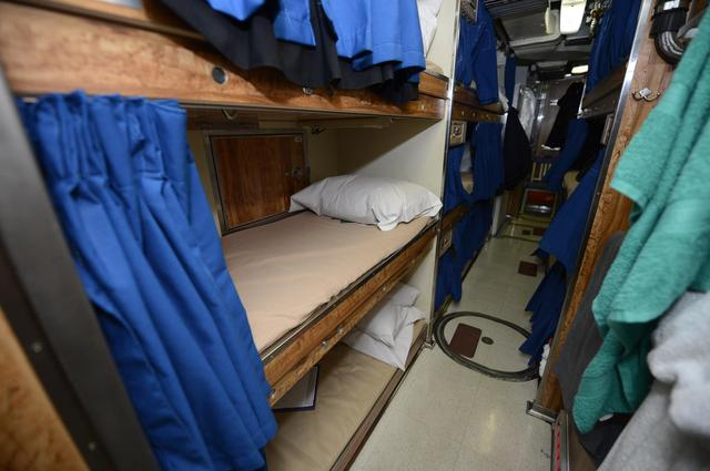 这是SSN-787潜艇艇员的铺位,床铺采用3层两侧相对的设计,中间是过道。铺位宽度并不大与我国的卧铺车厢里的床铺差不多大。