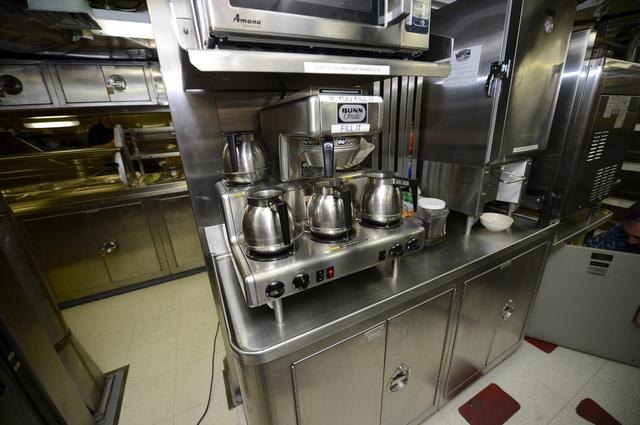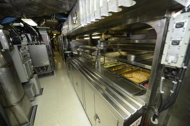 SSN-787潜艇内部的厨房,应该说这个空间在潜艇内部算是相当宽敞的。美军采用的是自助式供餐。因此能看到自助餐盘内已经有加工好的食物。