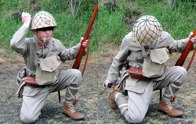 图为现代战争重演活动中对日军手榴弹投掷动作的还原,拔除保险销之后,日军教范要求投弹手选择在两个地方猛磕手榴弹引信,一个是脑袋上的头盔,另一个是军靴后跟的铁鞋掌,这两个部分是手握手榴弹很容易磕到的位置。当然,在实际的战斗中,鬼子步兵可以随时随地选择石头或者其他什么硬物去磕引信,但教范严格禁止的是在木板或者木箱上磕引信,因为木头有一定的弹性,有可能使引信无法正常动作。
