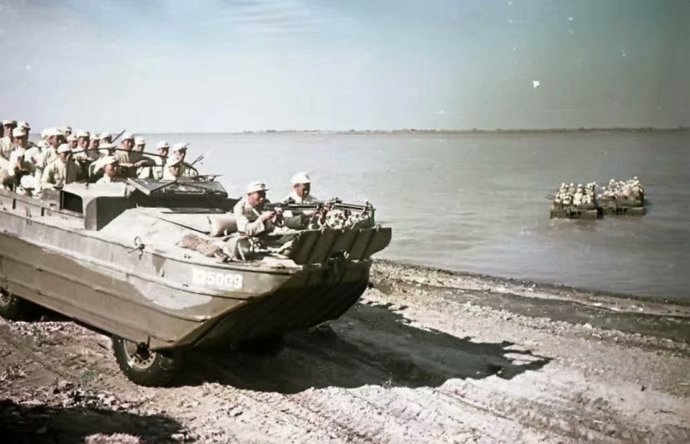 这是解放军为即将开始的渡江战役进行的演习,解放军坐着一辆美国DUKW两栖运输车,车头架了两挺日本“歪把子”机枪,如果现在电影里出现这种情景肯定被会被人说成是神剧,但这就是历史真实照片,解放军的武器真的并不差。