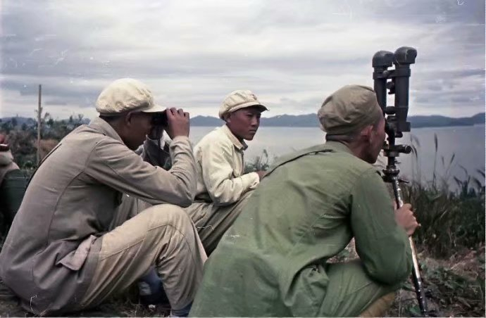 渡江战役开始前,炮兵指挥官通过炮队镜和望远镜观察对岸的敌情。