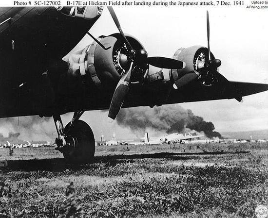 在日军空袭珍珠港时降落在希凯姆机场上的一架B-17轰炸机,从背景中可以看到升起的滚滚浓烟。这架飞机很可能是卡尔•巴特尔默斯中尉(1st Lt。 Karl Barthelmess)驾驶的,巴特尔默斯中尉后来在地中海战区服役期间因为作战勇敢而荣膺银星勋章