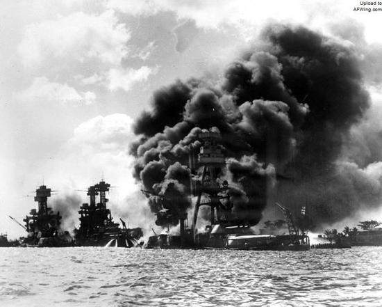 1941年12月7日正在遭受攻击的“战列舰大街”。位于照片中央的正在燃烧的是美国海军的“亚利桑那”号战列舰,该舰之前发生了一次大爆炸,导致1100多名海军官兵遇难。“亚利桑那”号左边的是“田纳西”号战列舰,再左边的是“西弗吉尼亚”号战列舰。“田纳西”号战列舰在空袭中幸存了下来,“西弗吉尼亚”号则被击沉,但不久即被打捞出水并修复