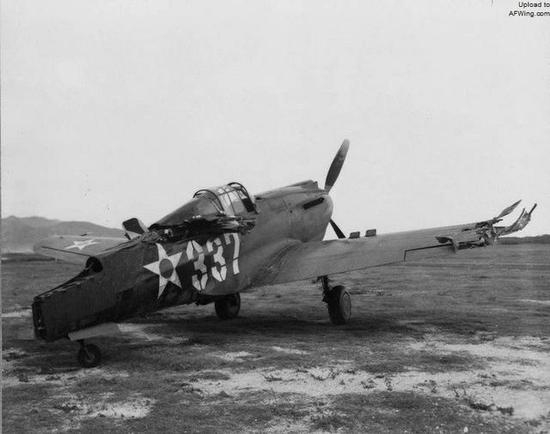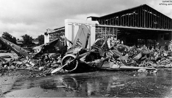 贝洛斯(Bellows)机场上一架严重受损的P-40战斗机。在空袭期间,14名美军飞行员驾驶着他们的P-40和P-36战斗机升空作战,并击落了10架日军飞机
