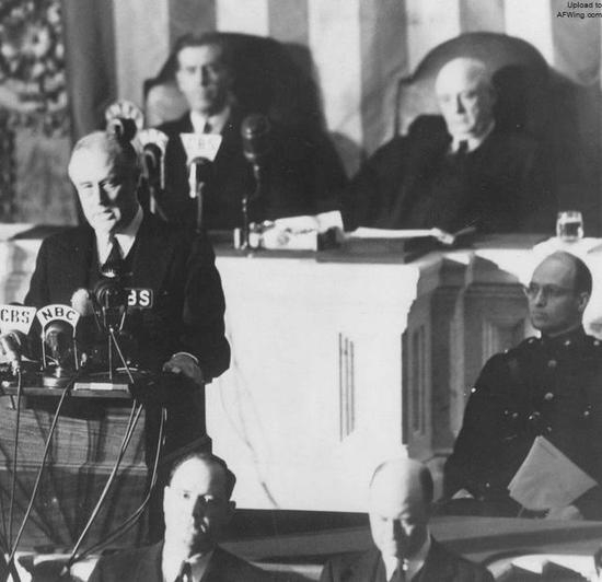 罗斯福总统在1941年12月8日的国会联席会议上发表了他那篇著名的《一个耻辱的日子》的讲话,在他后面的是副总统亨利•华莱士(Henry Wallace)和众议院议长萨姆•雷伯恩(Sam Rayburn)。位于罗斯福左侧的是他的长子詹姆斯•罗斯福,战争期间,作为一名海军陆战队员,小罗斯福由于作战英勇而荣膺了一枚海军十字勋章