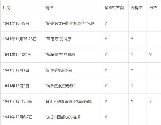 表1。“珍珠港事件”发生前有关方面对情报的了解情况