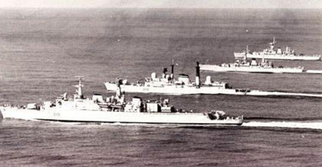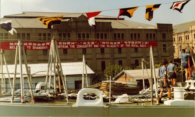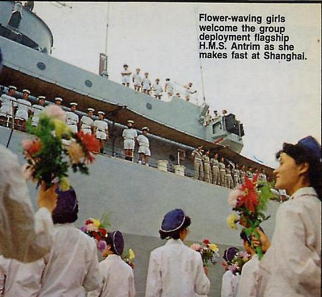 英国派出访问上海的4艘舰艇,从近到远依次是“安特里姆”号导弹驱逐舰(当时称轻巡洋舰)、“考文垂”号导弹驱逐舰、“羚羊”号导弹护卫舰、“活泼”号导弹护卫舰。