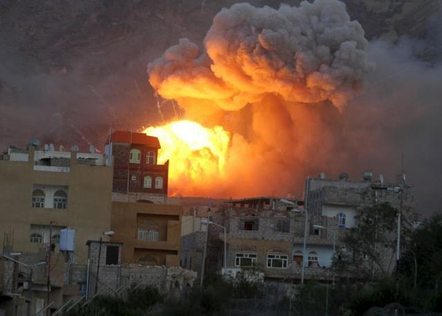 2015年5月11日,也门萨那,由沙特主导的空袭击中也门胡塞武装的军火库并引发爆炸,现场浓烟滚滚。