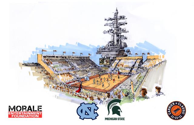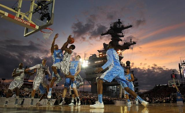 这场夜间篮球赛更加隆重。这是2011年11月11日,美国大学生篮球联赛(NCAA)在现役的“卡尔·文森”号核动力超级航母上举行,对,就是现在在东北亚热点地区巡航准备打仗的那艘航母。当晚有5000多人来看比赛,其中包括时任美国总统奥巴马。