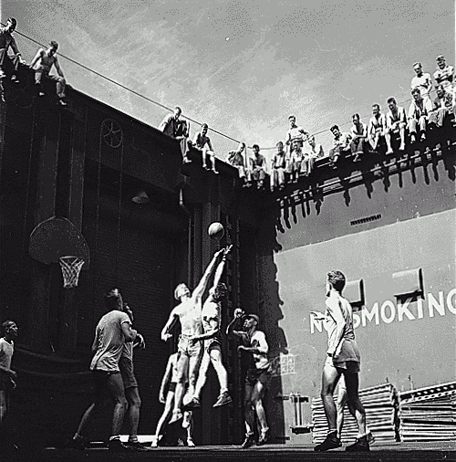 美国海军的老照片就有在航母上打篮球的场景。其中一个跳球的船员就是二战时在“蒙特里”号轻型航母服役的杰拉德。福特,也就是后来的美国总统。