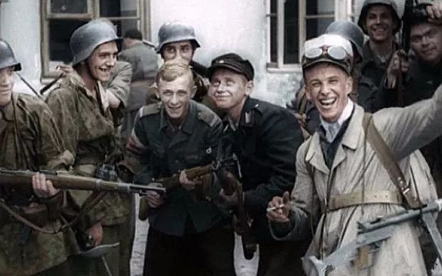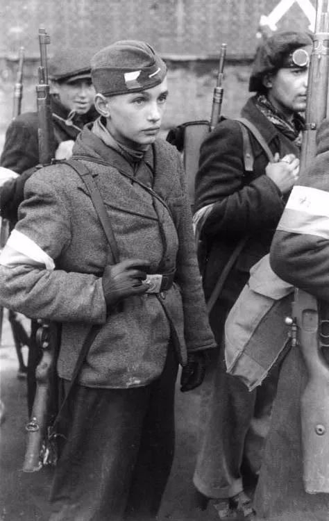 战斗中的起义军士兵,他们的服装很多是缴获自德军的,为了区分敌我他们在手臂绑了一块布。