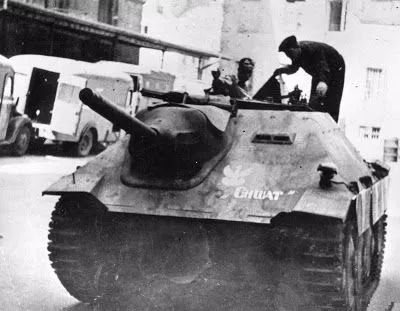 华沙起义军女兵站在一辆击毁的德军装备的缴获自意军的M13/40坦克残骸旁边。起义前期他们一度获得优势,自信心爆棚,期间据说苏联派来两名联络兵,希望能够取得联系和联合进攻,但是却遭到拒绝。但等德国援军到来后,起义军便瞬间溃败。