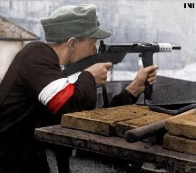 战争开始后兴奋的华沙起义军士兵,他们有的拿着缴获的德军98K步枪,有的挂着自制的闪电冲锋枪。这种枪可以使用英国援助的斯登冲锋枪子弹,但是当时英美盟军给他们空投的1000箱弹药物资中,有960箱落在了德军手里,19箱掉到苏军阵地,只有21箱落到起义军的占领区。